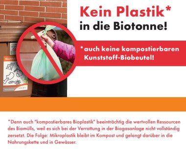 Auf keinen Fall darf Bioabfall in Kunststoff verpackt werden, auch nicht in kompostierbare Kunststoffbeutel!